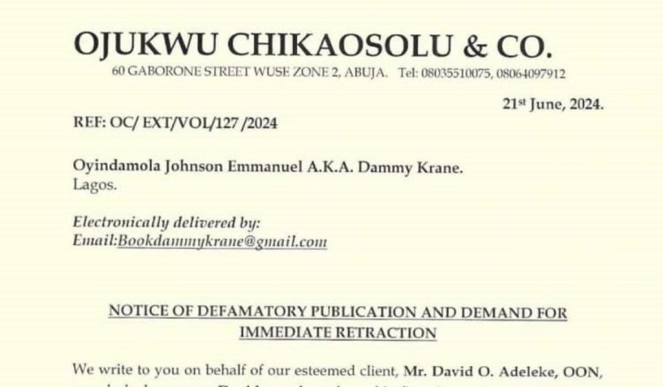 “Our client has further informed us that whilst in Abuja, he became aware of the latest in your series of defamatory posts, which is your publication of June 21, 2024, which you caused to be published on your X (formerly “Twitter”) page using the handle @dammy_krane, wherein you stated thus: